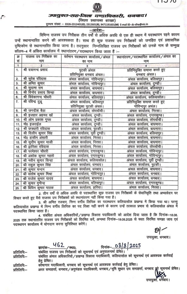 बाघमारा अंचल के 3 राजस्व उप निरीक्षकों का तबादला, 5 नए अधिकारियों की पदस्थापना