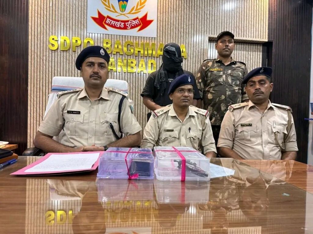 बाघमारा/धनबाद : विगत् दिनांक-17.09.2025 को सोनारडीह ओ०पी० क्षेत्र अन्तर्गत बढ़ई बस्ती स्थित शिव मंदिर के पास गुप्त सुचना के आधार पर घेराबंदी कर रितिक शर्मा, उम्र 23 वर्ष, पे०-बिनोद शर्मा, सा०-सोनारडीह बढ़ई बस्ती, थाना-मधुबन (सोनारडीह ओ०पी०), जिला-धनबाद को गिरफ्तार किया गया, जो किसी अपराधिक घटना को अंजाम देने की फिराक में था। तुत्पश्चात् रितिक शर्मा के बदन की तलाशी लेने पर उसके कमर में खोंसा हुआ 01 देशी लोडेड कट्टा, 01 जिन्दा कारतुस एवं 01 एन्ड्रोईड मोबाईल बरामद किया गया, जिसके आधार पर मधुबन (सोनरडीह ओ०पी०) कांड सं0-82/2025, दिनांक-18.09.2025, धारा-25 (1-बी) ए/26/35 आर्म्स एक्ट दर्ज किया गया है।