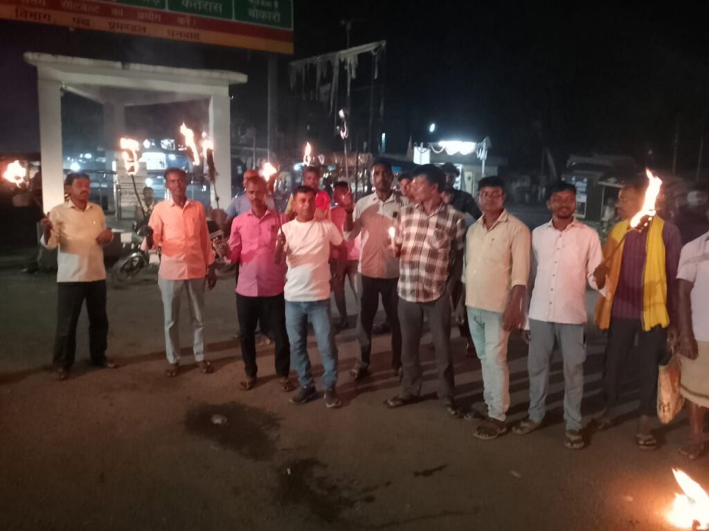 तोपचांची:- तोपचांची के रंगरीटांड बजरंगबली मंदिर से एक मसाल जुलूस निकाला गया. इस जुलूस का नेतृत्व कुडमि समाज के युवा नेता सदानंद महतो ने किया.यह मसाल जुलूस की शुरुआत रंगरीटांड के बजरंगबली मंदिर से गोमो रोड ,सुभाष चौक होते हुए जीटी रोड पर समापन किया गया.इस अवसर पर सदानंद महतो ने कहा कि छोटा नागपुर के भू-भाग में बसों बास करने वाले टोटोमेंस्टिक कुडमि आदिवासी हैं.यह जाति इस भू-भाग के भूमिफुट है.झारखंड,बंगाल और उड़ीसा में “रेल टेका” डहर छैका” आंदोलन के तहत 100 स्टेशनों का परिचालन ठप करने की घोषणा वृहद झारखंड आदिवासी कुडमि मंच ने किया है.इस दौरान धनबाद के तोपचांची प्रखंड के कुडमि साथियों से अपील है कि नजदीक के स्टेशनों में भाग लेकर इस आंदोलन को सफल करें.इस अवसर पर सदानंद महतो ने कहा कि केंद्र सरकार अनिश्चितकालीन प्रदर्शन के बाद भी नहीं माने तो आर्थिक नाकेबंदी बृहद झारखंड आदिवासी कुडमि मंच इसकी घोषणा जल्द करेगी.कुडमियों को आदिवासी सूची में शामिल करो,कुडमाली भाषा को आठवीं अनुसूची में शामिल कऱो तथा सरना धर्म कोड लागू करो की मांग प्रमुख हैं. इस अवसर पर सरयू प्रसाद महतो,बिंदेशवरी महतो,द्वारिका महतो,राजेश महतो,अनिल महतो,तुलसी महतो,टेकलाल महतो,तारा प्रसाद महतो,सुरेश महतो ओमप्रकाश महतो,विनोद बिहारी महतो आदि सैकड़ो लोग मौजूद थे.